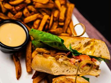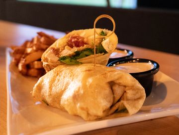 Poitrine de poulet grillés, fromages à poutine, salade, piments fort et une sauce cornichons maison dans un pain wrap