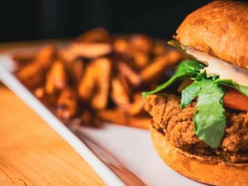 Un délicieux pain brioché avec poulet croustillant, salades, tomates, cornichons, sauce mayo épicée maison