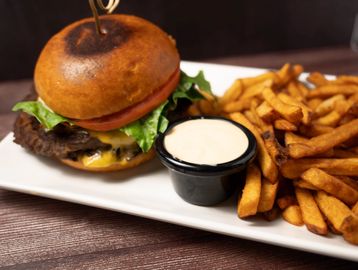 Galette de bœuf, fromage cheddar, salades, tomates, cornichons et une sauce cornichons maison servi dans un pain brioché